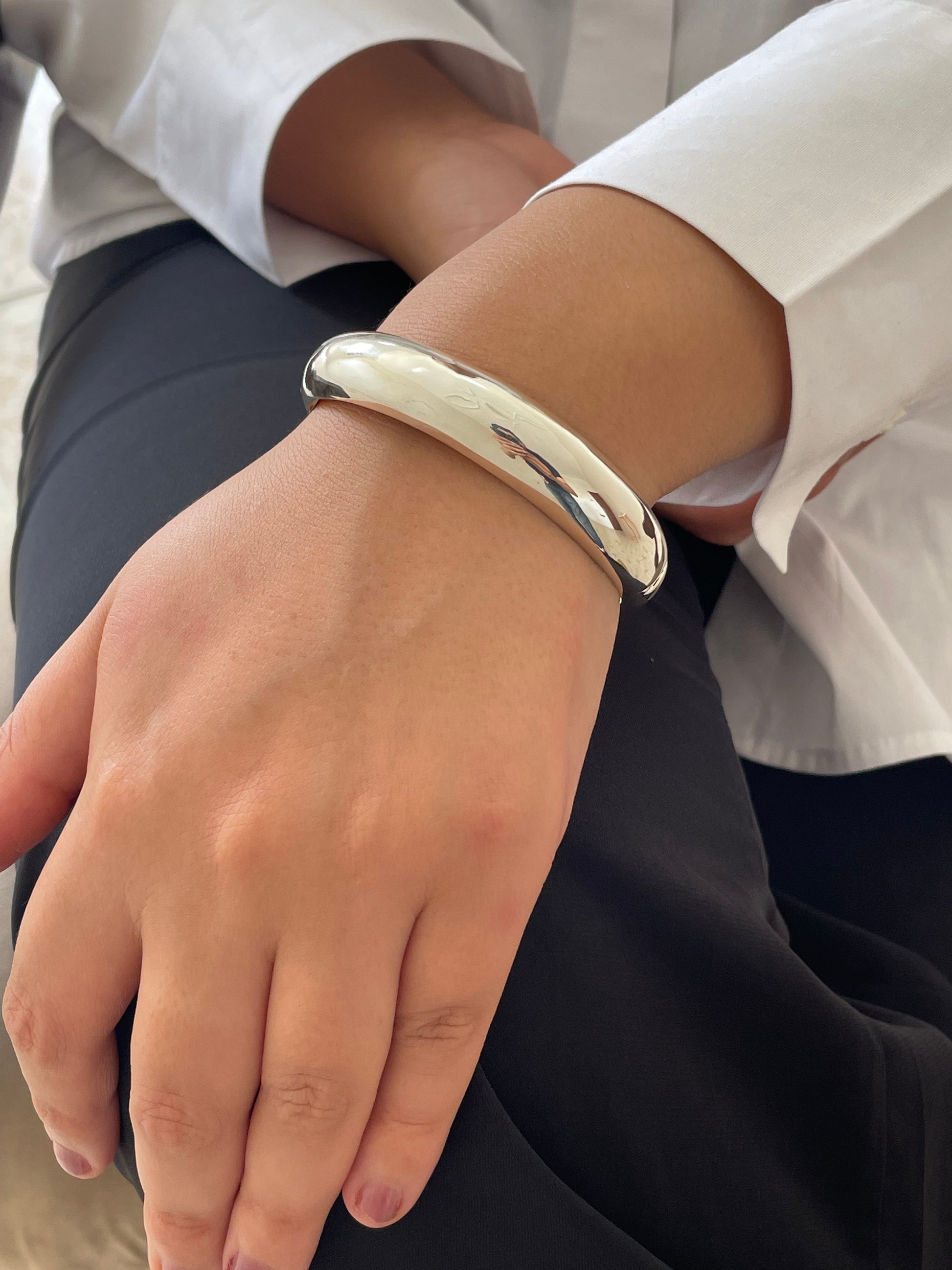The chunky design provides a substantial look while remaining comfortable for daily wear. Its smooth surface reflects light beautifully, making it a versatile addition to any jewelry collection. Whether worn alone or stacked with other pieces, this bangle adds a touch of contemporary style to any outfit.