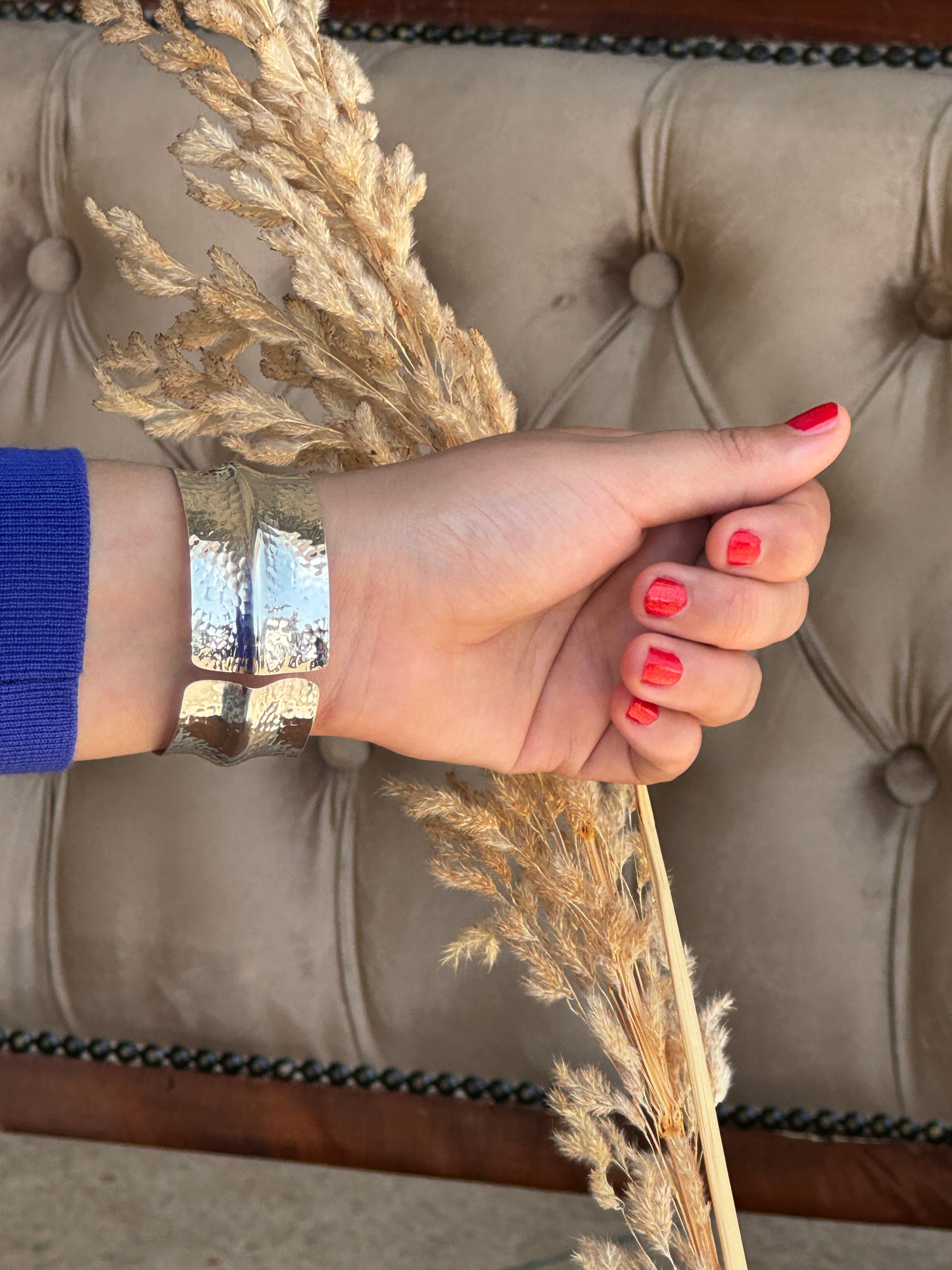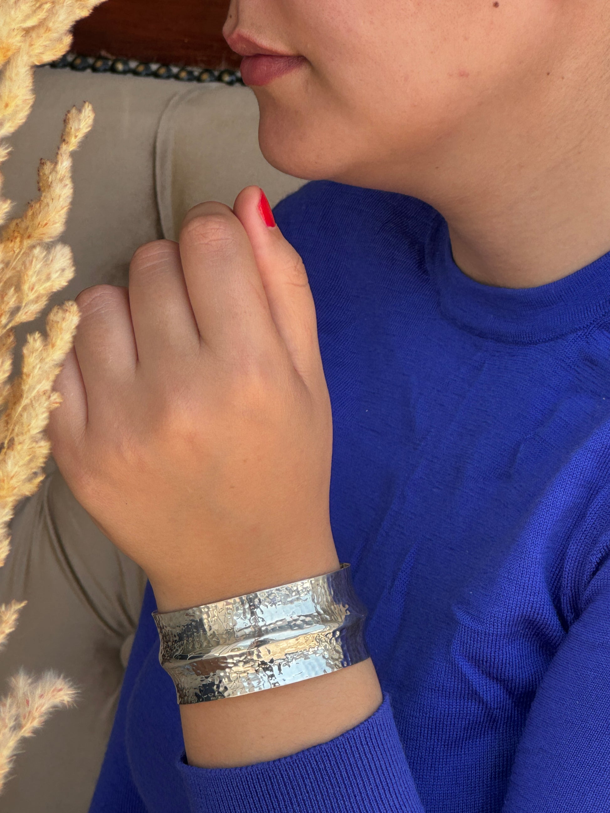 Elevate your accessory collection with our Hammered Silver Sterling Cuff Bangle. This exquisite piece showcases a unique hammered texture that beautifully captures and reflects light, adding depth and character to your look.
