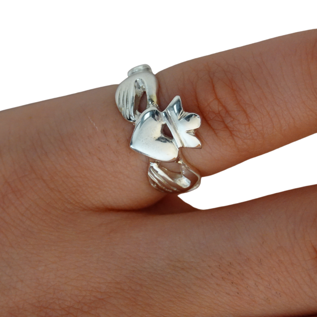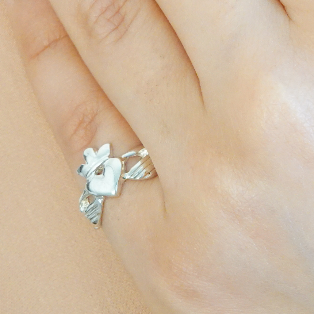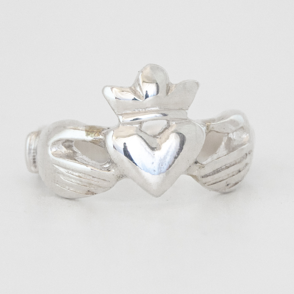 The sterling ring features Irish claddagh design that symbolizes romance, friendship, commitment, family.