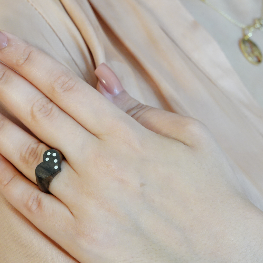 This is a bentwood ring made from walnut wood. Hand carved heart with five sterling dots, which symbolize the fifth anniversary of marriage or partnership. A perfect gift for her, since wood is the traditional gift that speaks for life and growth that is waiting for both of you.
