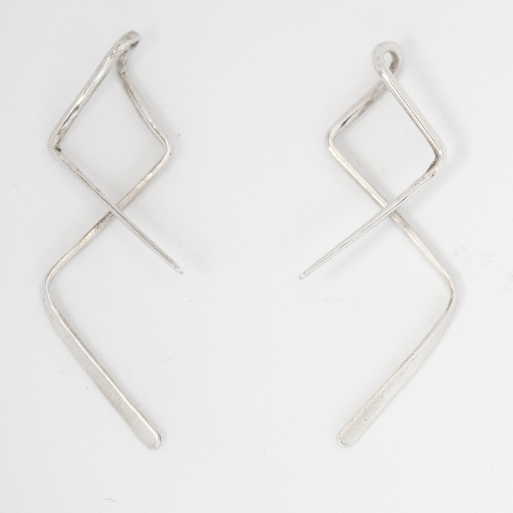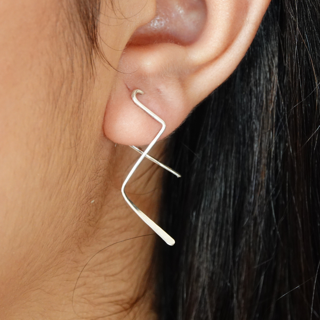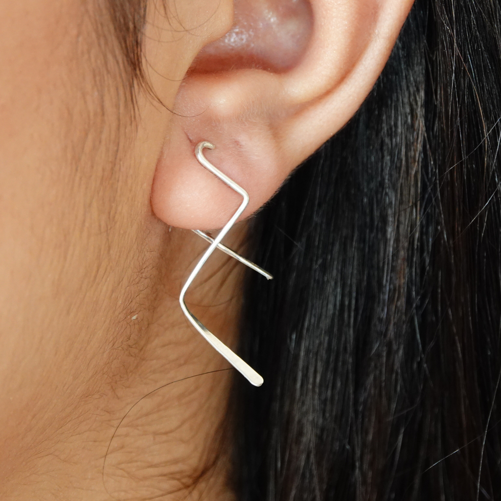 A fashionable style of earrings made of sterling silver, carefully curved and twisted to prevent them from falling and to hold into the earlobe comfortably.