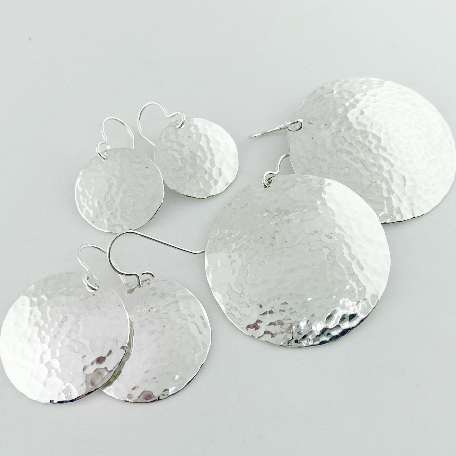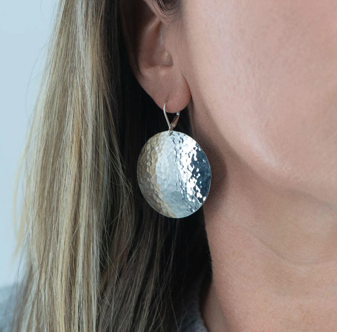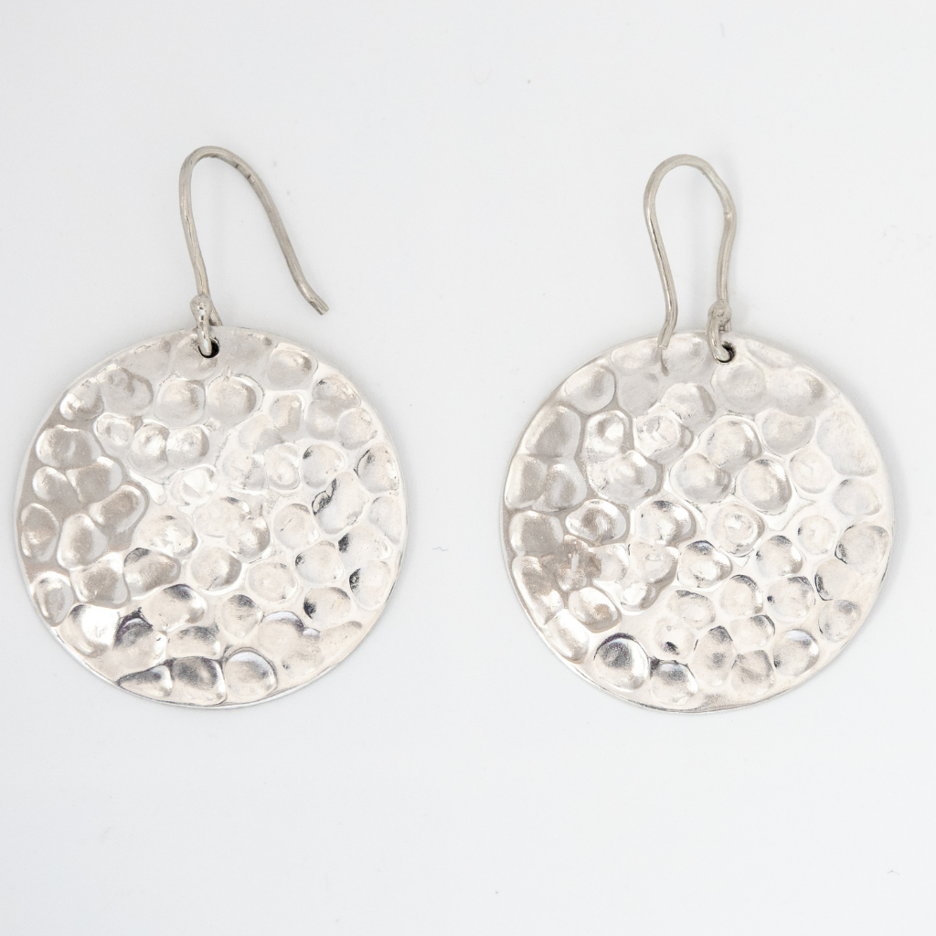 These sterling silver dangle earrings are round, hammered texture and have a hook closure, then polished for a mirror finish.