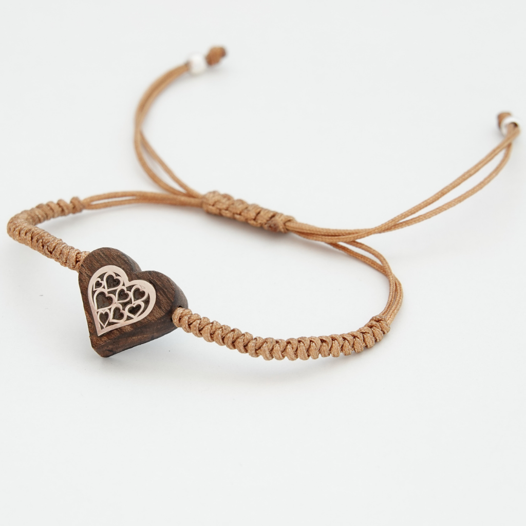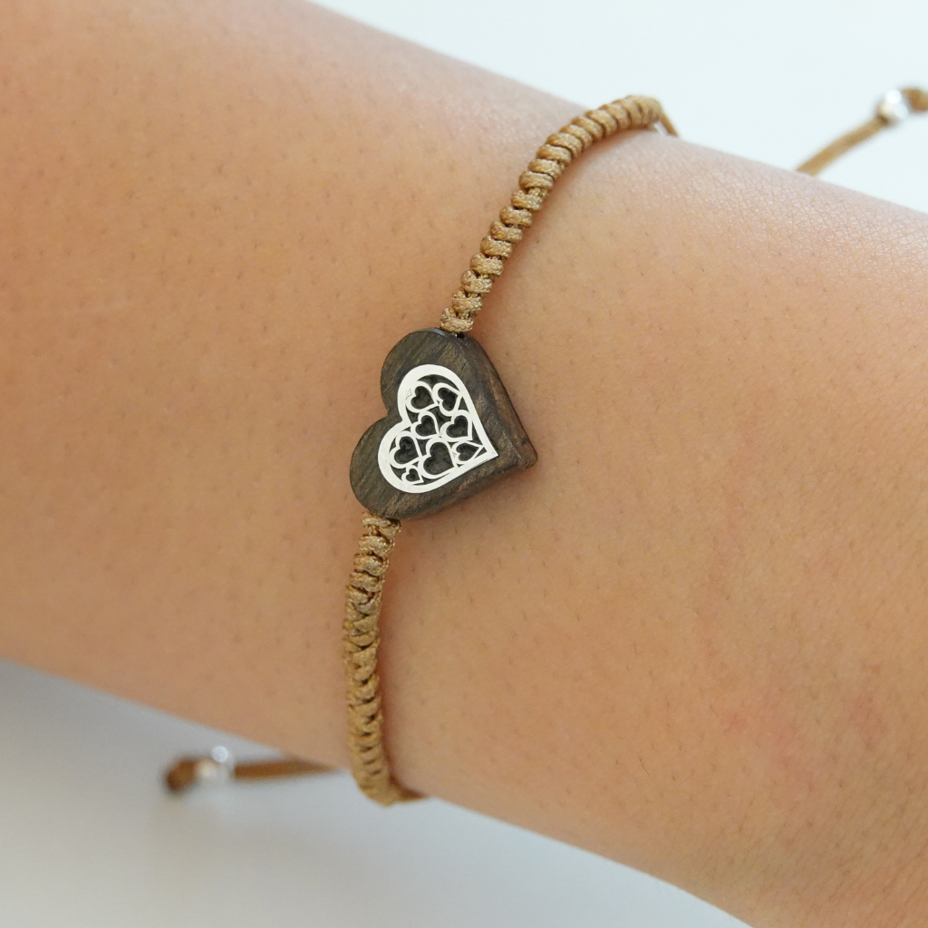 In the middle of this minimalist bracelet, a wooden heart and in the middle of the wooden heart, there is another set of small hearts made of sterling silver.