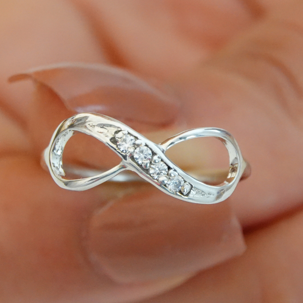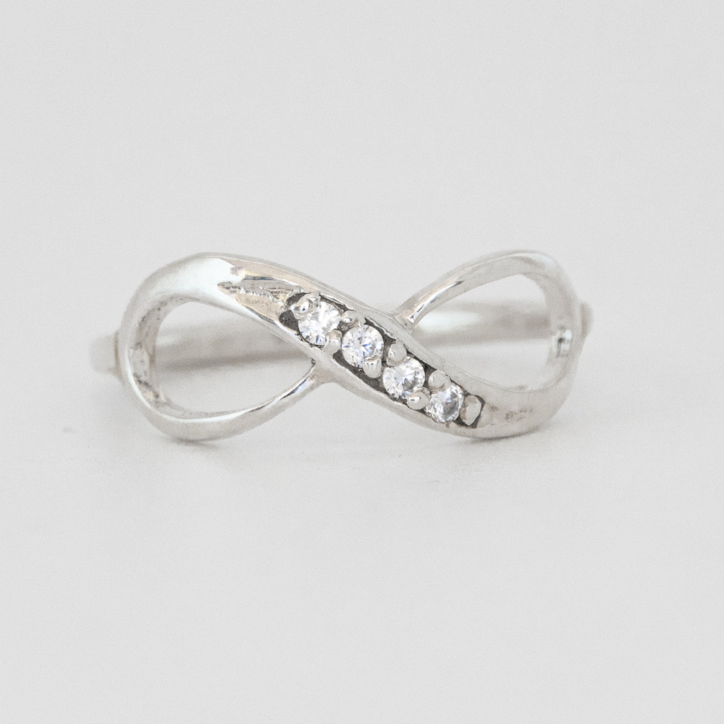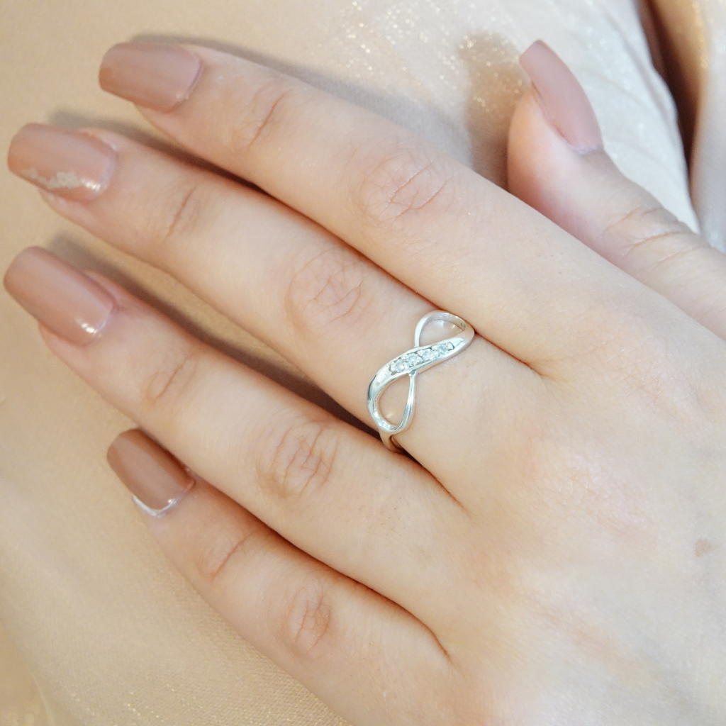 Our minimalist ring has an infinity symbol, with zircon stones laying in the middle of the loop which adds a unique touch and shine to the ring.