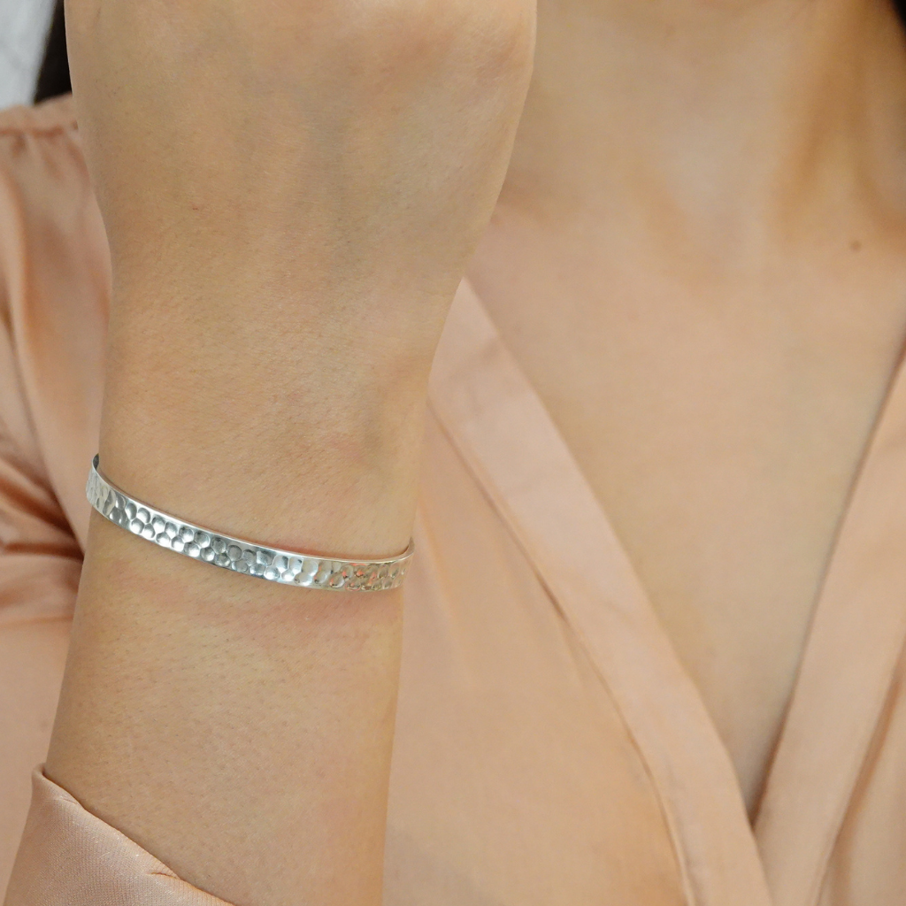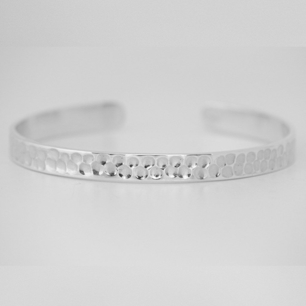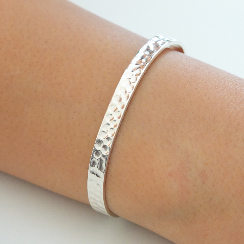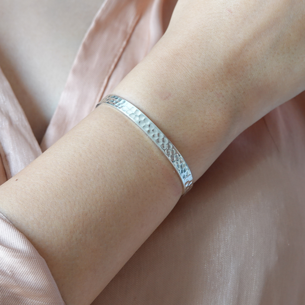 A striking yet simple open bangle bracelet handmade from sterling silver, it has an unusual hammered design which really catches the eye.