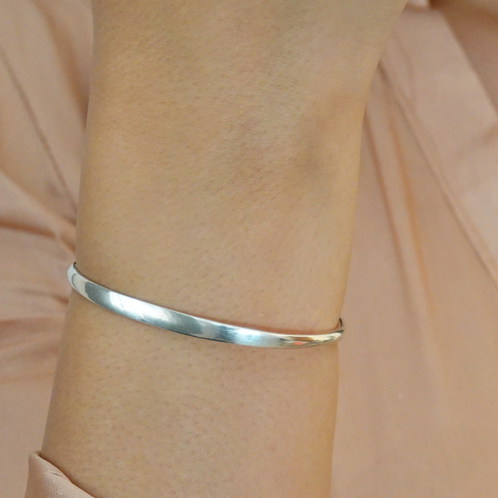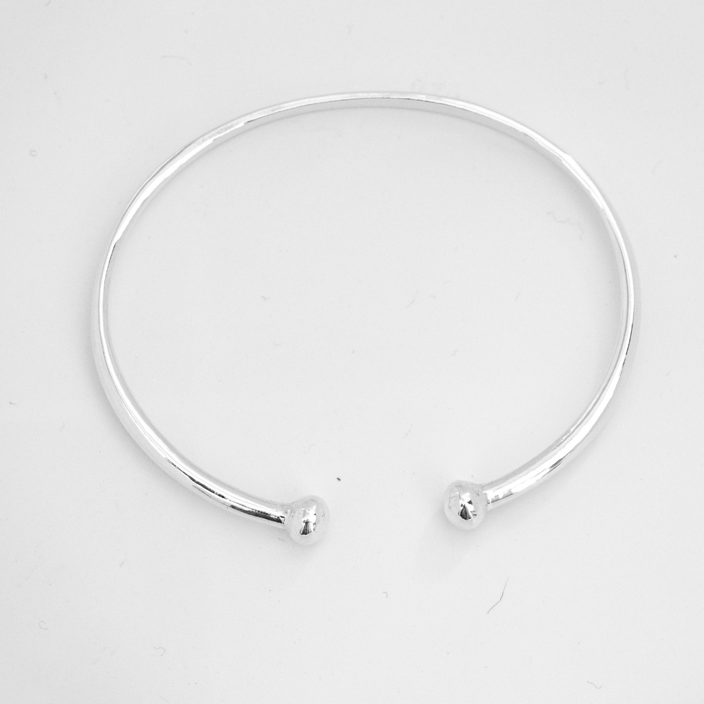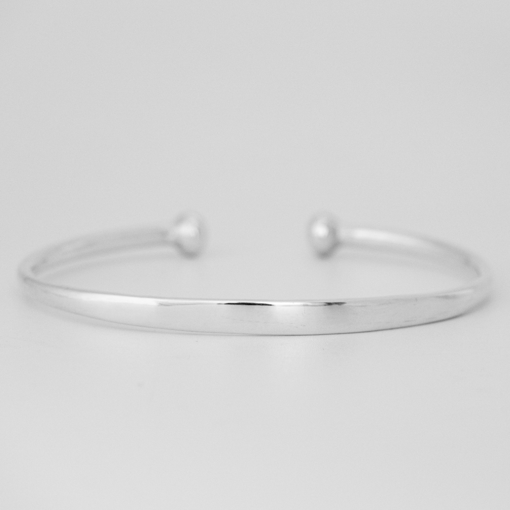 Our bangle is handmade of sterling silver and minimally detailed with stoppers of silver that count as adornments.