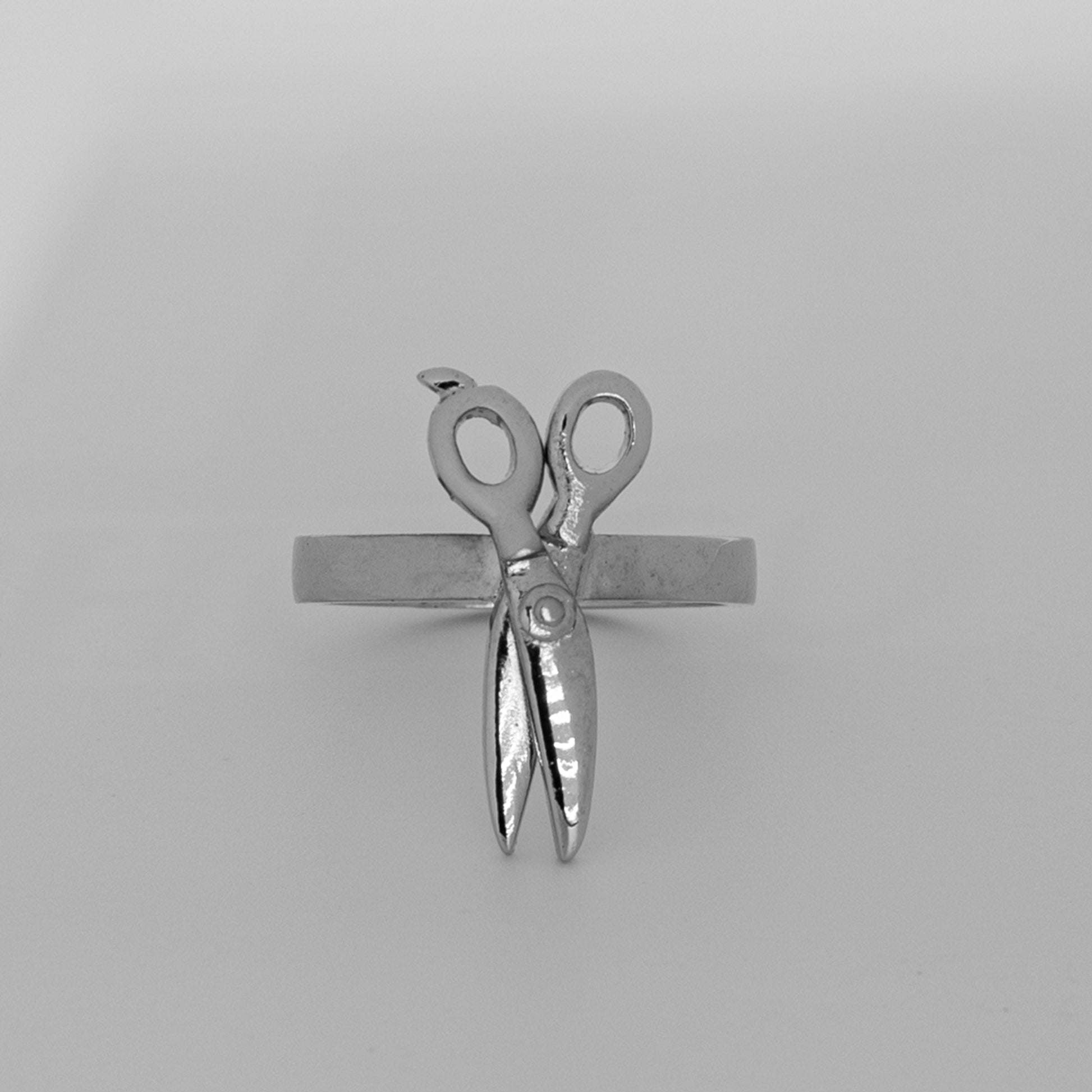 A piece of heavy silver (99.9% pure silver) wire has been flattened at each end and hand sawn to create the scissor ends. These ends have then been filed to create a smooth finish. The ring has then been hand forged into an open band.